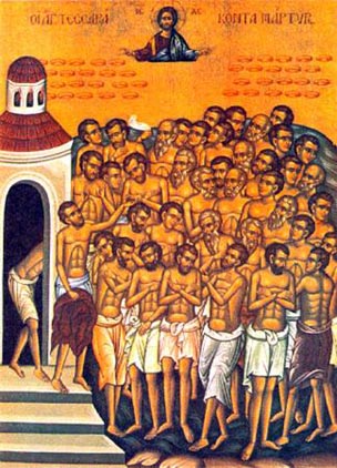 The Restoration of the Temple of the 40 Martyrs is celebrated on this day. At Tsar'grad two churches were built to them: one, by the emperor Anastasias I (491-518), and the other, by the emperor Tiberius (578-582). For this feastday is known a service in the Greek Meneion of the XIII Century.