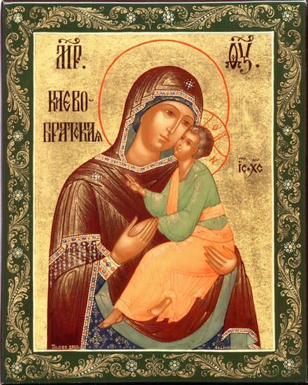 The Kievo-Bratsk Icon of the Mother of God was situated at first in the Borisoglebsk church in the city of Vyshgorod (Kiev), where it miraculously appeared in the year 1654. In 1662, during the time of war of Russia with Poland (1659-1667), the city was dealt heavy losses by the Crimean Tatars fighting on the side of the Polish. The temple of the holy Passion-Bearers Boris and Gleb was destroyed and defiled. But the Providence of God preserved the holy wonderworking icon of the Mother of God, which was taken out of the church beforehand in time and set off along the Dniepr, and the relics of the saints they hid beneathe a crypt. The river carried the icon to the Podola river-bank at Kiev, where it was joyfully taken up by the Orthodox and with due reverence transferred to the Bratsk monastery. In the records of church property of the Kievo-Bratsk monastery, made in the year 1807, was given its description. There existed a "Song about the wonderworking Kievo-Bratsk Icon of the Mother of God", compiled soon after the year 1692.Celebration of the Kievo-Bratsk Icon of the Mother of God is made thrice within the year: 6 September, 10 May and 2 June. All these days are dedicated to the miraculous appearance of the holy icon in 1654. The original of the icon has not been preserved. The icon copy was written from it "measure for measure", and is at present located in the Kiev monastery of the Pokrov (Protection) of the Mother of God.