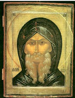 The Monk Anthony, a very great ascetic, the founder of wilderness-monastery life and as such the father of monasticism, is entitled "the Great" by Holy Church. He was born in Egypt in the village of Coma, near the Thebaid wilderness, in the year 251. His parents were pious Christians of illustrious lineage. From his youth Anthony was always serious and given over to concentration. He loved to visit church services and he hearkened to the Holy Scripture with such deep attention, that he remembered what he heard all his entire life. The commandments of the Lord guided him from the time of his very youth. When Saint Anthony was about twenty years old, he lost his parents, but in his care remained his sister, a minor in age. Visiting the church services, the youth was pierced through by a reverent feeling towards those Christians who, as it relates in the Acts of the Apostles, sold off their possessions and the proceeds thereof they applied in following after the Apostles. He heard in church the Gospel passage of Christ, spoken to the rich young man: "If thou wouldst be perfect, sell what thou hast and give it to the poor; and thou wilt have treasure in heaven; and come follow after Me" (Mt. 19: 21). Anthony understood this as spoken to him personally. He sold off his property that remained to him after the death of his parents, he distributed the money to the poor, he left his sister in the care of pious virgins in a monastic setting, he left his parental home, and having settled not far from his village in a wretched hut, he began his ascetic life. He earned his livelihood by working with his hands, and alms also for the poor. Sometimes the holy youth also visited other ascetics living in the surrounding areas, and from each he sought to receive direction and benefit. And to a particular one of these ascetics he turned for guidance in the spiritual life.